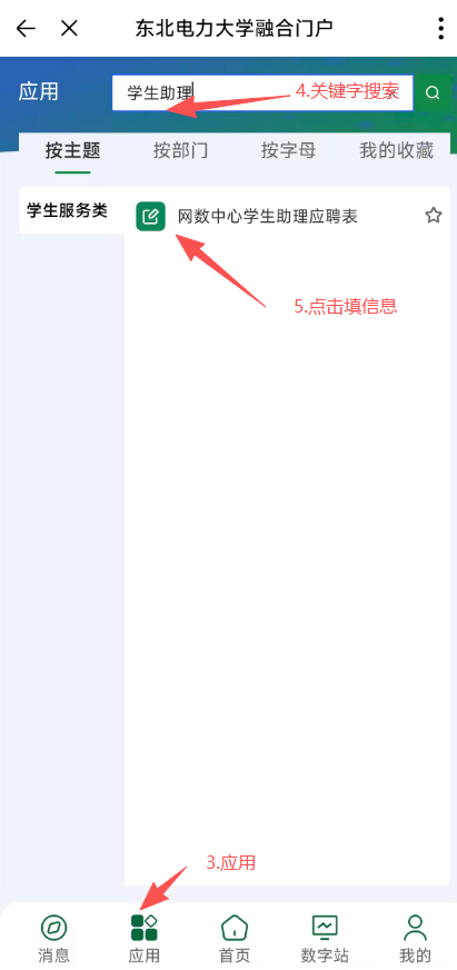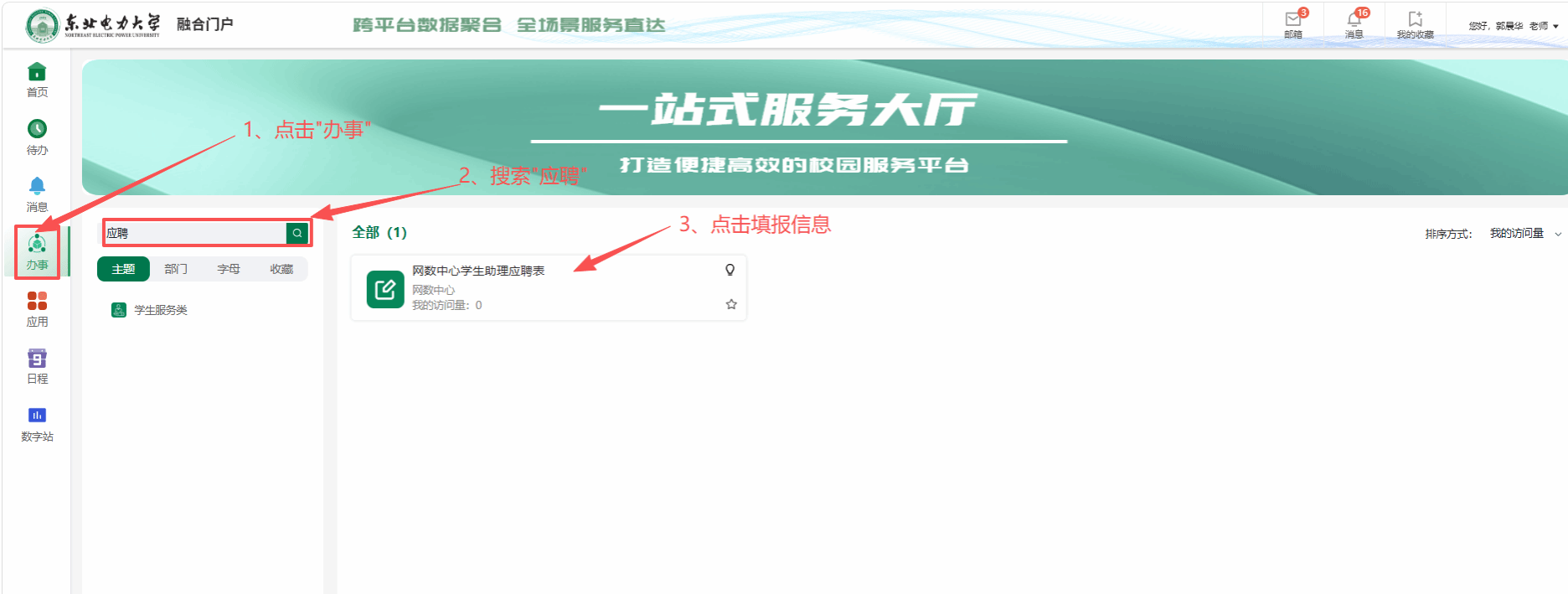 有意报名的同学,请通过“融合门户”--“办事”--“网数中心学生助理应聘”,填写完整信息并提交。